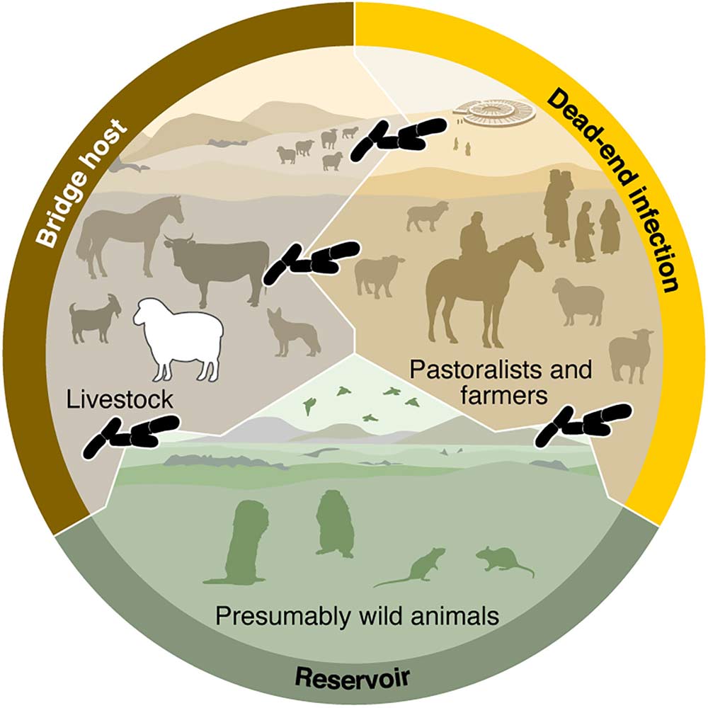 — Возбудитель чумы, по разным генетическим оценкам, возник от 7 до 20 тысяч лет назад. Был выявлен природный предок этой бактерии, от которого она произошла в результате мутации. На протяжении последних нескольких тысяч лет эта бацилла продолжала эволюционировать, и от предковой формы возникла линия, которой было дано название LNBA (Late Neolithic Bronze Age), указывающее на период позднего неолита и бронзового века. Штаммы этой линии были выделены из костей людей, живших в Поволжье 5–6 тысяч лет назад.
