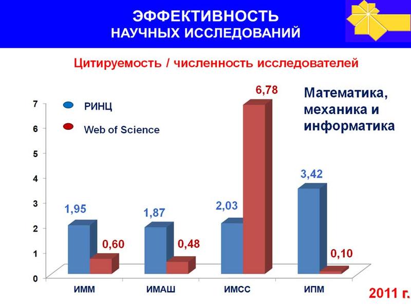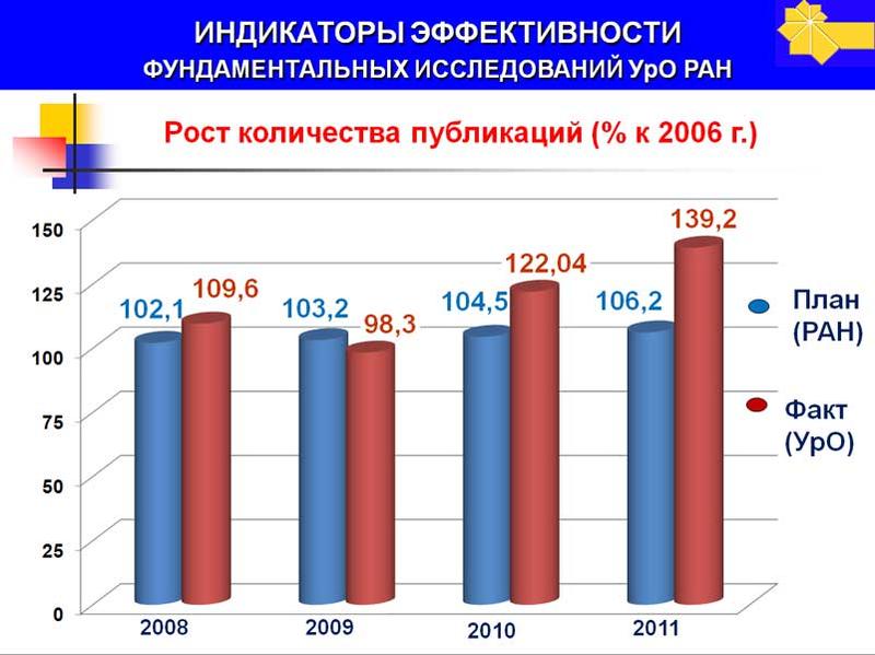 Сегодня в СМИ часто звучат упреки в неэффективности в адрес ученых РАН и других академий. К примеру, недавно министр здравоохранения и соцразвития Т. А. Голикова подвергла критике Академию медицинских наук, сотрудники которой имеют низкий уровень цитирования и крайне мало печатаются в авторитетных журналах. Что касается Уральского отделения РАН, то прошлогодний план по публикациям мы перевыполнили. В 2011 году ученые УрО опубликовали более 3 500 статей, из них 2 849 в России и 712 (около 20%) в зарубежных реферируемых изданиях. Заметный прирост продемонстрировали геологи, экономисты и гуманитарии, которые раньше сильно отставали.