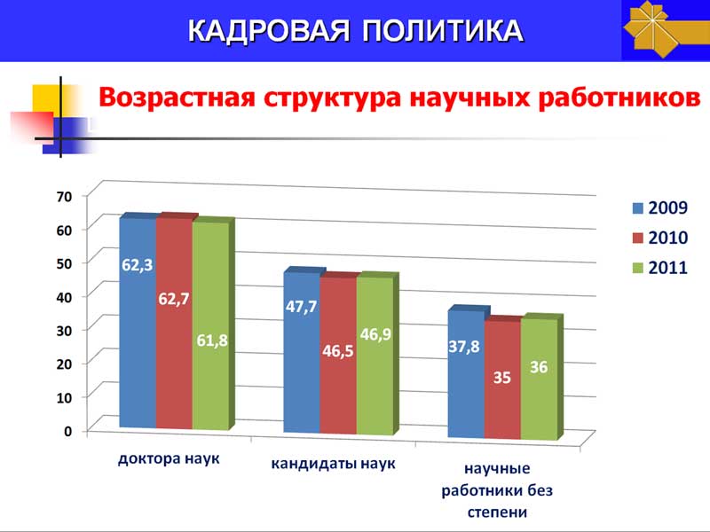 Говоря о кадровой политике, академик В. Н. Чарушин отметил, что в 2011 году численность сотрудников Отделения увеличилась за счет дополнительных ставок для молодых ученых, а также за счет совместителей. Средний возраст научных сотрудников остался в общем на прежнем уровне. Помимо традиционных мер поддержки научной молодежи, в 2011 году был проведен новый конкурс инновационных проектов (поддержано 22 проекта на сумму 2, 8 млн рублей). Еще одно новшество последнего времени — цикл семинаров для молодых ученых по развитию английской разговорной речи и навыков выступлений на английском языке. На базе школы №16 в Академическом районе Екатеринбурга возрождена Малая академия наук.