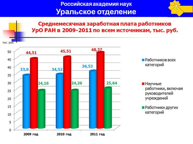 Среднемесячная зарплата сотрудников УрО в 2011 году увеличилась на 5, 82% (6, 28% — научные работники, 5, 69% — работники других категорий) и составила 36 тыс. рублей (у научных сотрудников, включая руководителей учреждений, — 48 тыс. рублей), что превышает средние показатели по региону. Однако обнаружилась и негативная тенденция: увеличилась доля расходов на оплату труда и на выплаты по оплате труда за счет внебюджетных источников.