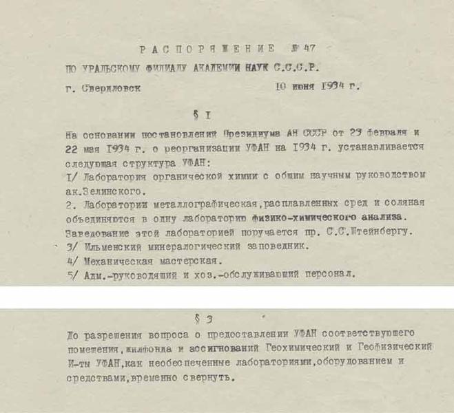 Фактически к 1934 г. вместо трех институтов в УФАНе были созданы лишь несколько небольших лабораторий Химического института. Учитывая сложившиеся объек-тивные и субъективные условия, 13 февраля 1934 года Президиум АН СССР принял решение в связи с отсутствием кадров и недостатком помещений временно отложить создание Геофизического и Геохимического институтов и реорганизовать УФАН путем объединения мелких лабораторий Химического института и укрепления их научно-производственной базы (см. документ вверху). Ситуация сложилась критическая. 5 марта 1934 г. И. И. Малышев в обращении к председателю Уральского облисполкома Б. Ф. Головину пишет: «…в настоящее время филиал не имеет ни копейки денег, … а поэтому вынужден продавать свое оборудование». Двумя неделями позже в рапорте в Комиссию по базам АН СССР он сообщает: «. .. И. Д. Кабакова (секретаря Уралобкома ВКП(б)) посетила делегация уральской профессуры и выразила свое недовольство по поводу постановления АН. Профессора заявили, что институты в филиале должны быть. .. .После посещения профессорами т. Кабакова мне в Исполкоме совершенно категорически заявили. .. о прекращении реорганизации. .. ».