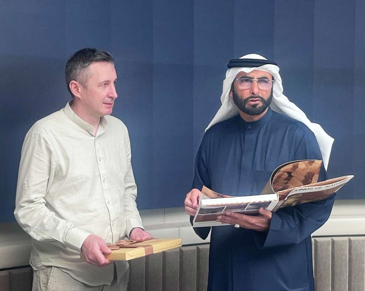 На фото: ход пресс-конференции (фото В. Бурнашева); В.А. Соколов с Мохаммедом Ахмедом Аль Боварди, вице-президентом Государственного агентства по окружающей среде Абу Даби; искусственное гнездо для кречета; в центре: памятный знак Луи Дюпарку; переправа вброд через реку Катышор на Северном Урале; панорама одного из карьеров Гусевогорского титаномагнетитового (железо-ванадиевого) месторождения в Качканаре; тенка керамического горшка эпохи бронзы и неолитический ров