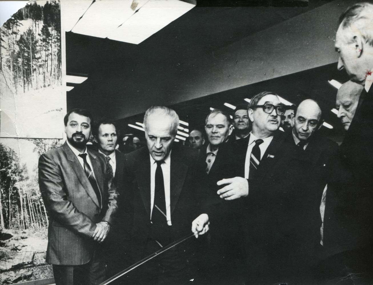 На архивных снимках: В.А. Трапезников в годы Великой Отечественной войны; открытие Физико-технического института со специальным конструкторским бюро и опытным производством УНЦ АН СССР в Ижевске с участием академиков А.П. Александрова (президент АН СССР в 1975–1986 гг.), А.М. Прохорова, Г.Н. Флерова, К.В. Фролова, будущего академика Э.С. Горкунова. В центре с указкой – В.А. Трапезников. 1983 г.