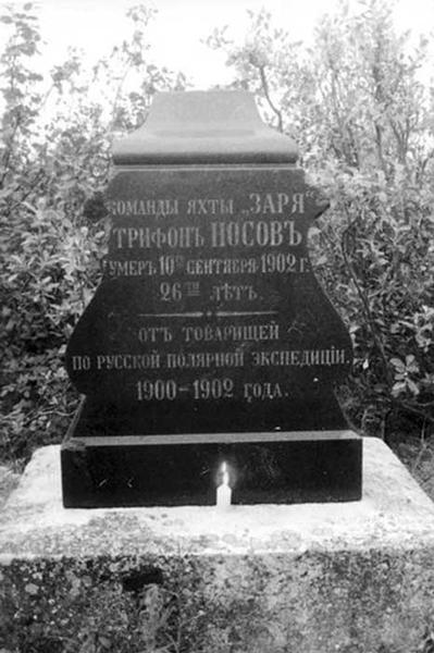 Потрясает то, что оставшиеся в живых участники экспедиции Э. Толля изготовили Т. Носову памятник в Петербурге и доставили его на могилу матроса. На черном отполированном камне, по форме напоминающем корабельную рынду-колокол, выбиты слова: «Команды яхты «Заря» Трифон Носов умер 10-го сентября 1902 г. 26-ти лет. От товарищей по Русской полярной экспедиции 1900–1902 года».