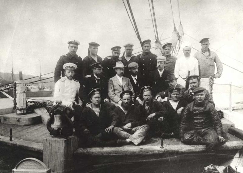 Экипаж шхуны «Заря». В центре сидит Э. Толль (в шляпе), за ним стоит А. Колчак. Кто здесь Т. Носов, неизвестно. Однако можно предположить, что это матрос с окладистой бородой в первом ряду, потому что староверы из с. Усть-Цильмы, как правило, не бреются. Фото из интернет-Википедии